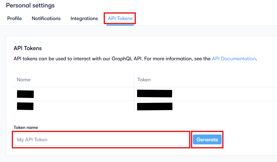 API Tokensをクリックし、新しいトークンの名前を入力・Generateをクリックします。