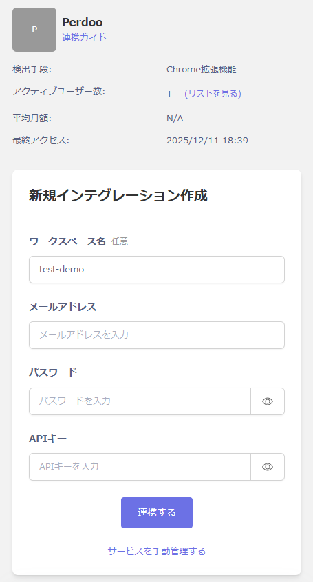 任意のワークスペース名、Perdooログイン用メールアドレス・パスワード、前の手順で取得したAPIキーを入力し、連携するをクリックします。