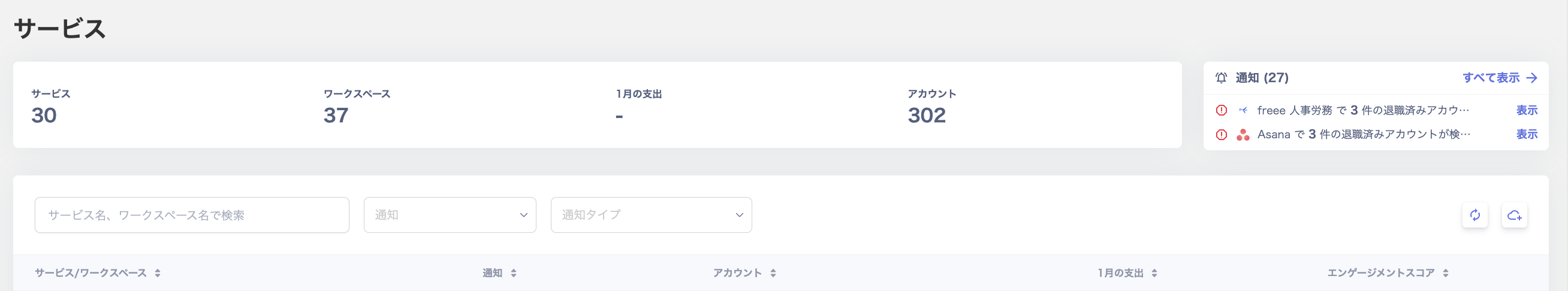 画面上で「サービス名/ワークスペース名/通知/アカウント数/支出/エンゲージメント」等の情報をひと目で確認できます。