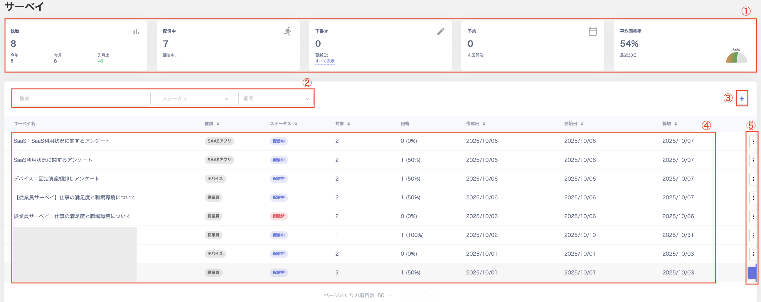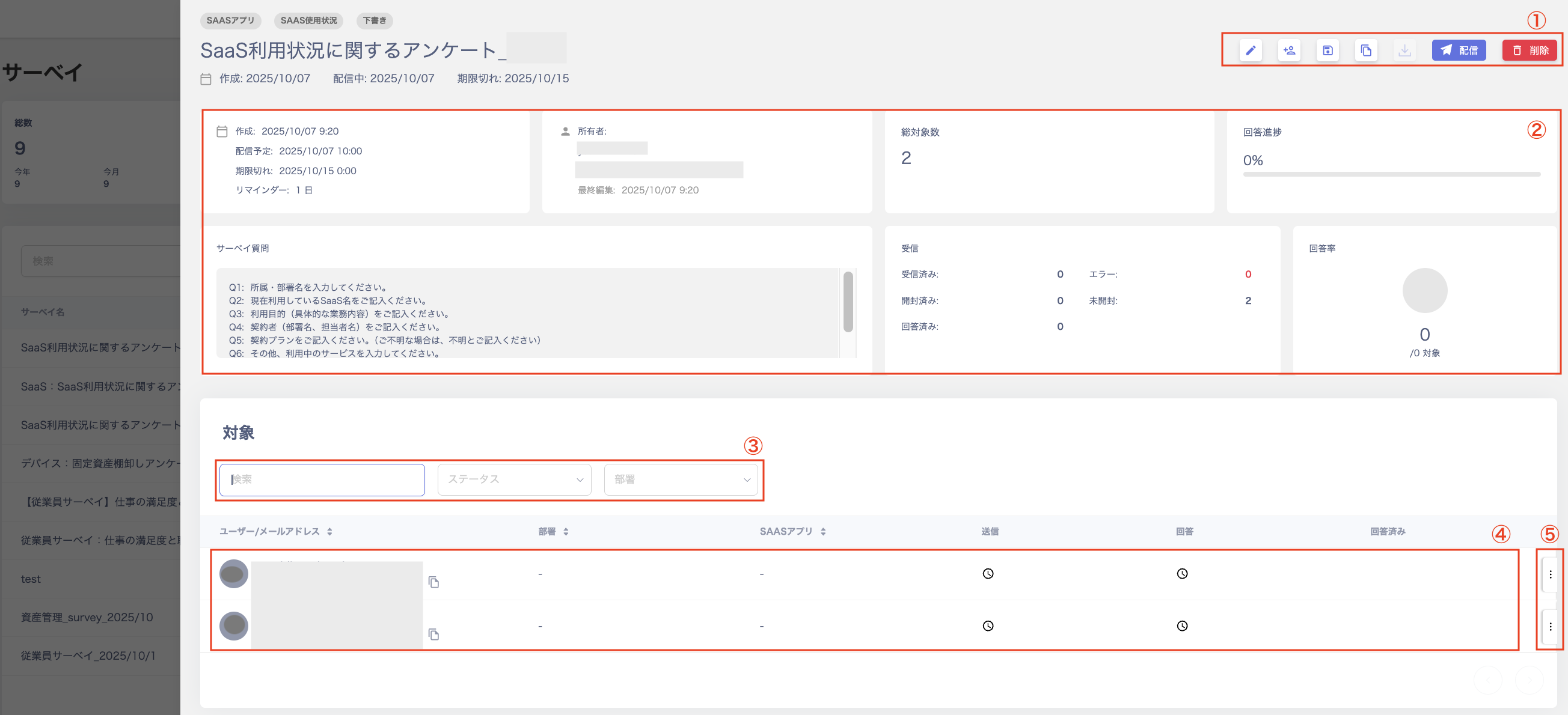 ②ダッシュボード:「作成内容/所有者/総対象数/回答進捗/サーベイ質問/受信/回答率」を確認できます。
