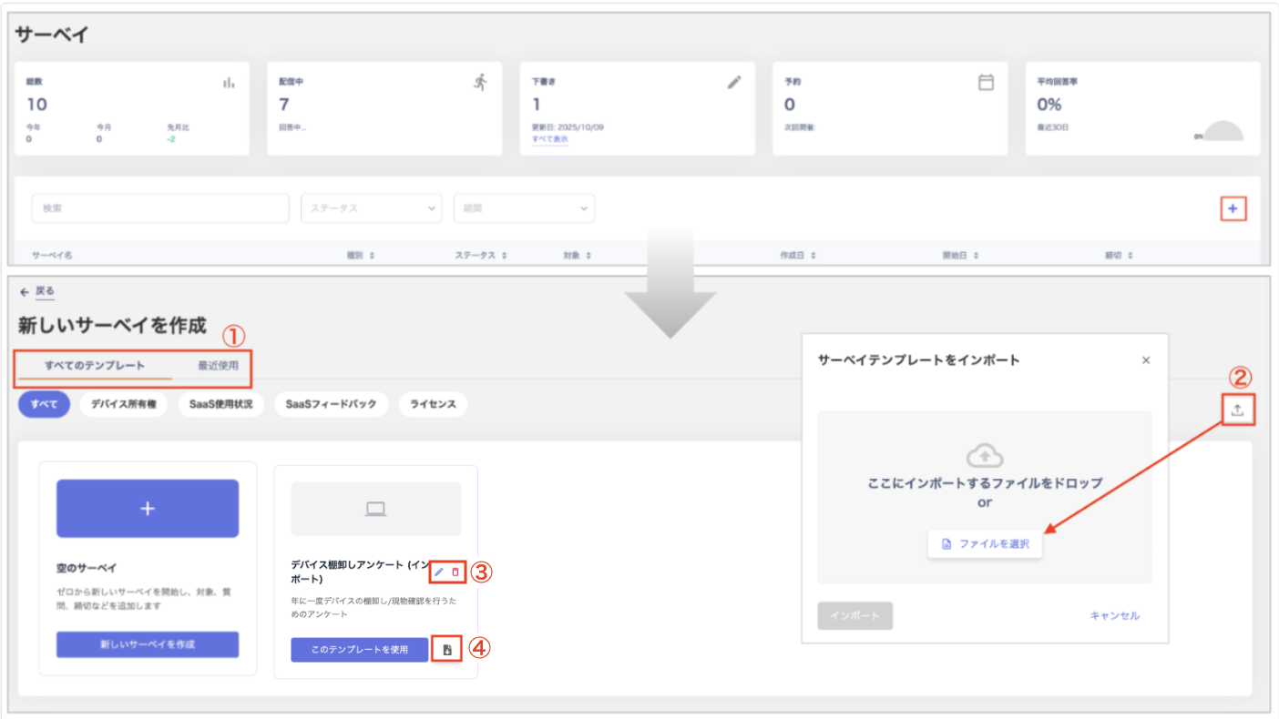 ②インポート:「サーベイテンプレートをインポート」画面でサーベイテンプレートをインポートできます。詳細はテンプレートをインポートするをご参照ください。