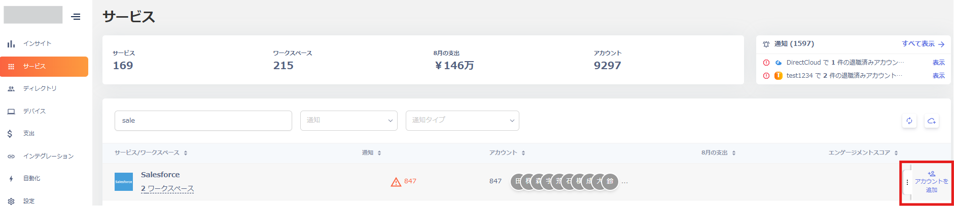 ※ [アカウント追加ボタン]は本機能に対応するサービスにのみ表示されます。詳細は連携可能SaaS一覧 をご参照ください。