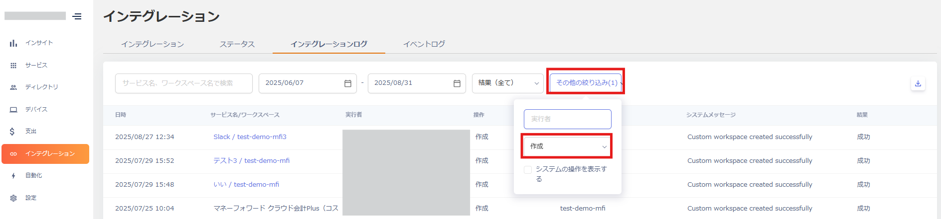 インテグレーション > インテグレーションログより、その他の絞り込み > 作成のログでご確認いただけます。