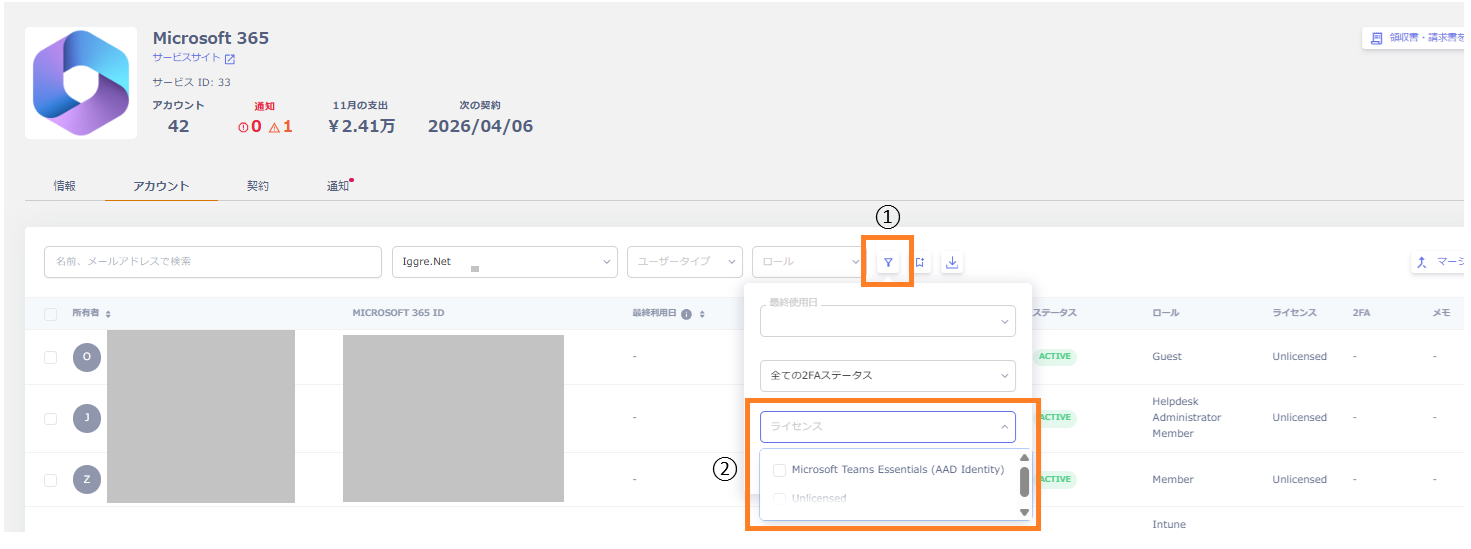 「アカウント」タブでは、①フィルタリングのマーク、②ライセンスの手順で保有ライセンスの確認が可能です。