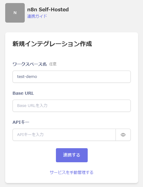任意のワークスペース名、前の手順で取得したBase URL、APIキーを入力し、連携するをクリックします。