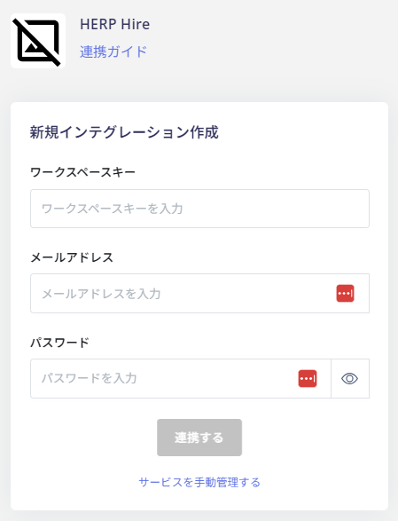 ワークスペースキーには企業ID、HERP Hireログイン用メールアドレス・パスワードを入力し、連携するをクリックします。
