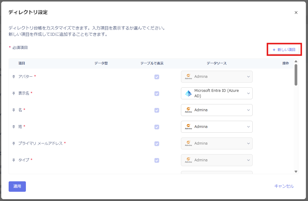 - 「ディレクトリ項目」画面の「データソース」欄で連携するデータソースを設定できます。プルダウンで選択できる項目は設定可能です。設定後、[適用]をクリックします。機能詳細や連携項目(部署名など)は設定可能なカスタム入力項目をご参照ください。