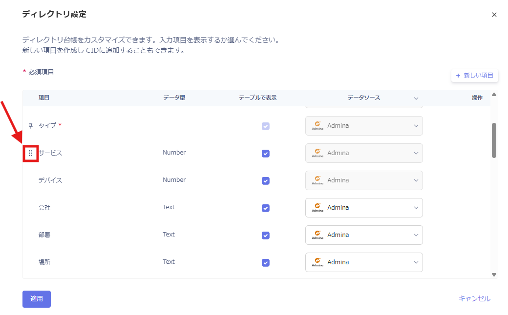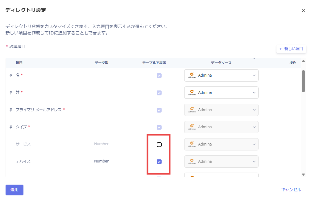 従業員マスターを設定している場合、ディレクトリ項目のデータソースを設定できます。データソースはAdmina、従業員マスターに設定しているサービス(HRM)から選択できます。従業員マスターに設定可能なサービスは対応するクラウドサービスをご参照ください。