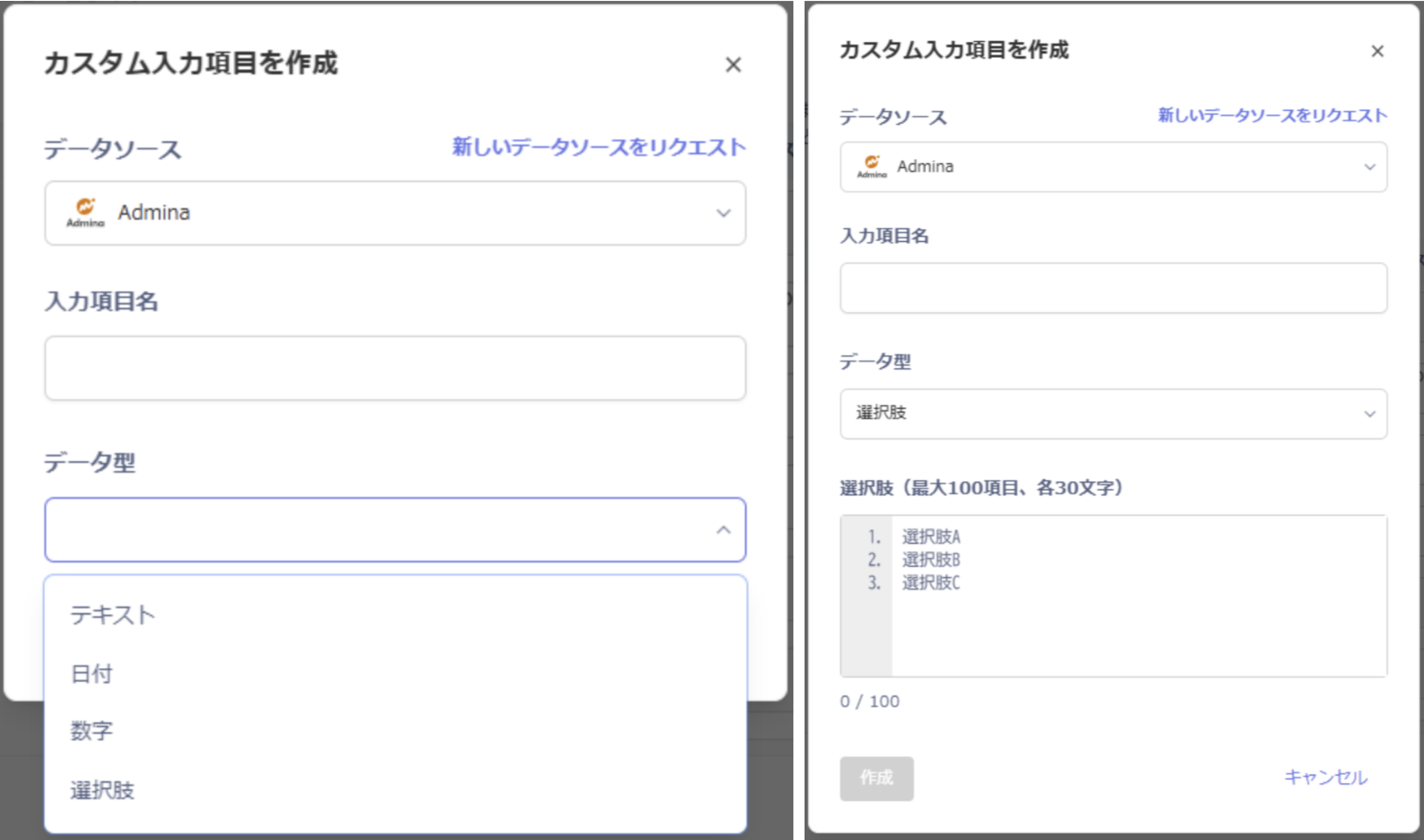 - 「カスタム入力項目を作成」画面で「データソース、入力項目名、データ型」を設定して[作成]をクリックします。