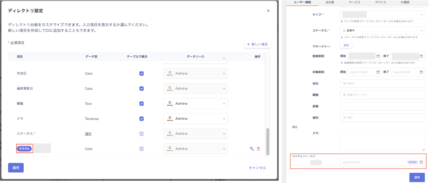 - データソースを設定して同期後、設定が反映され、ユーザー情報>カスタムフィールドに表示されます。