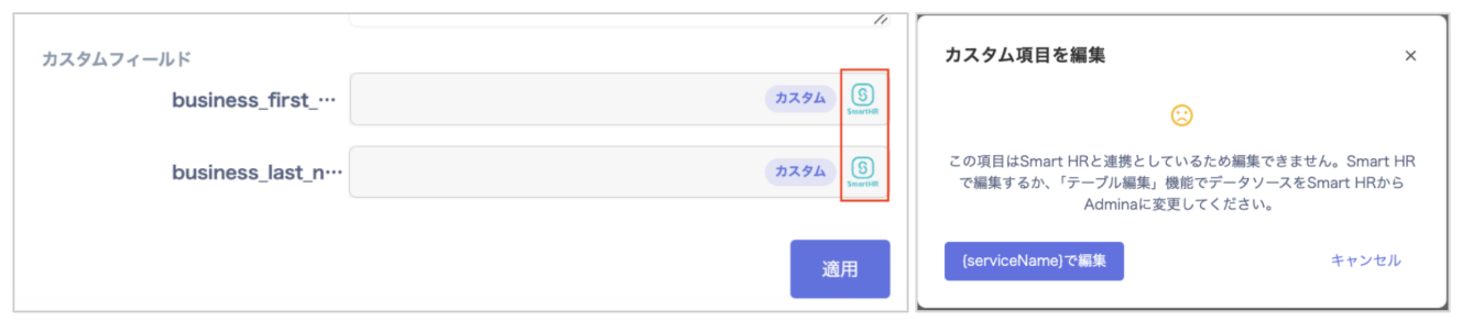 入力欄をクリックすると、「カスタム項目を編集」が表示されます。カスタム項目を編集する場合は連携サービス側で編集、またはデータソース設定で変更して編集します。