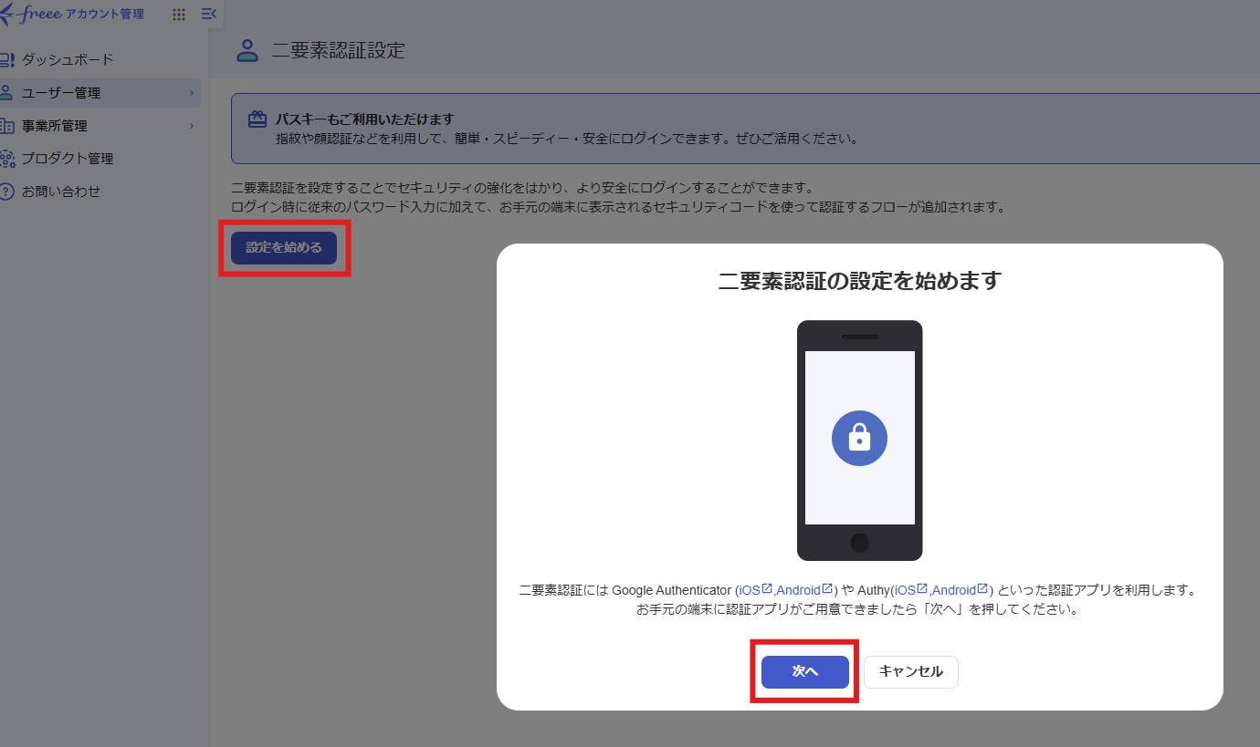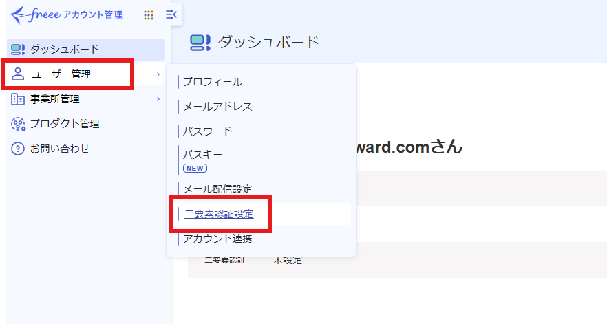 ログイン後、ユーザー管理 > 二要素認証設定 をクリックします。