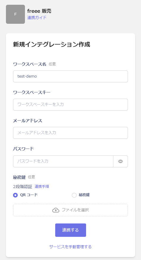 秘密鍵には、二段階認証有効時の連携手順 を参考に画像ファイルを添付、もしくは秘密鍵を入力し、連携するをクリックします。