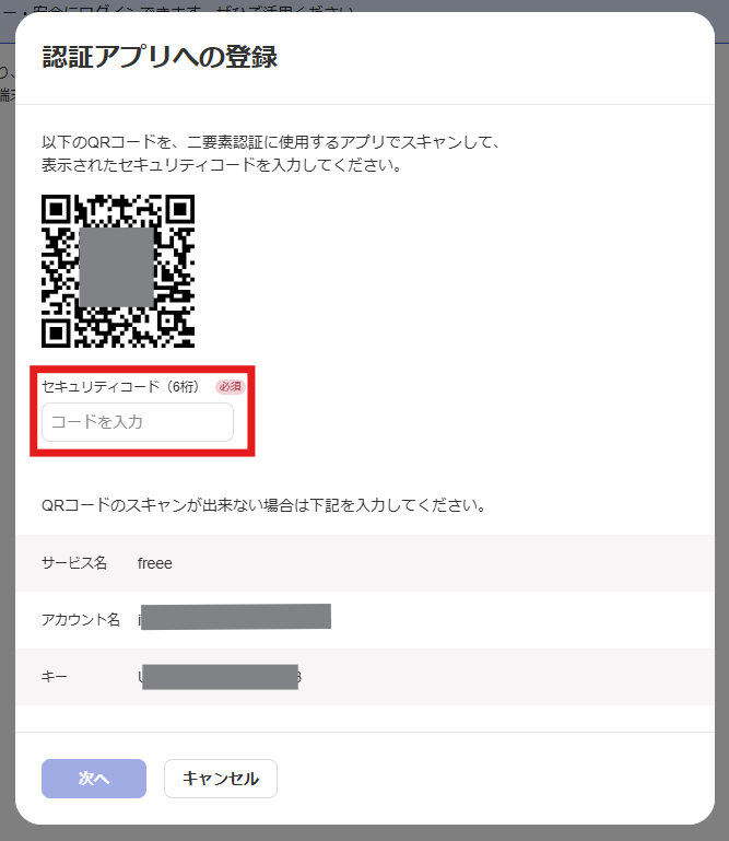 認証アプリで生成された6桁のコードを入力し、次へをクリックします。