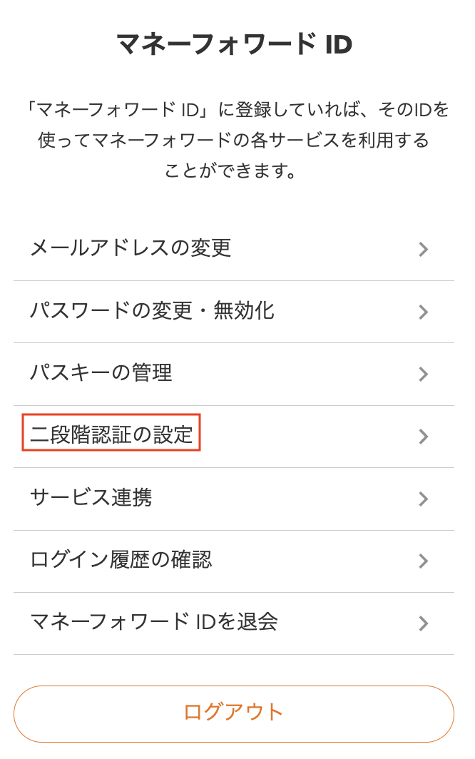 「マネーフォワードID」画面で[二段階認証の設定]を有効にすることで、二段階認証を使ってログインできます。