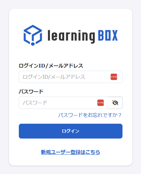 learningBOXログインページにて、メールアドレス・パスワードを入力し、ログインします。