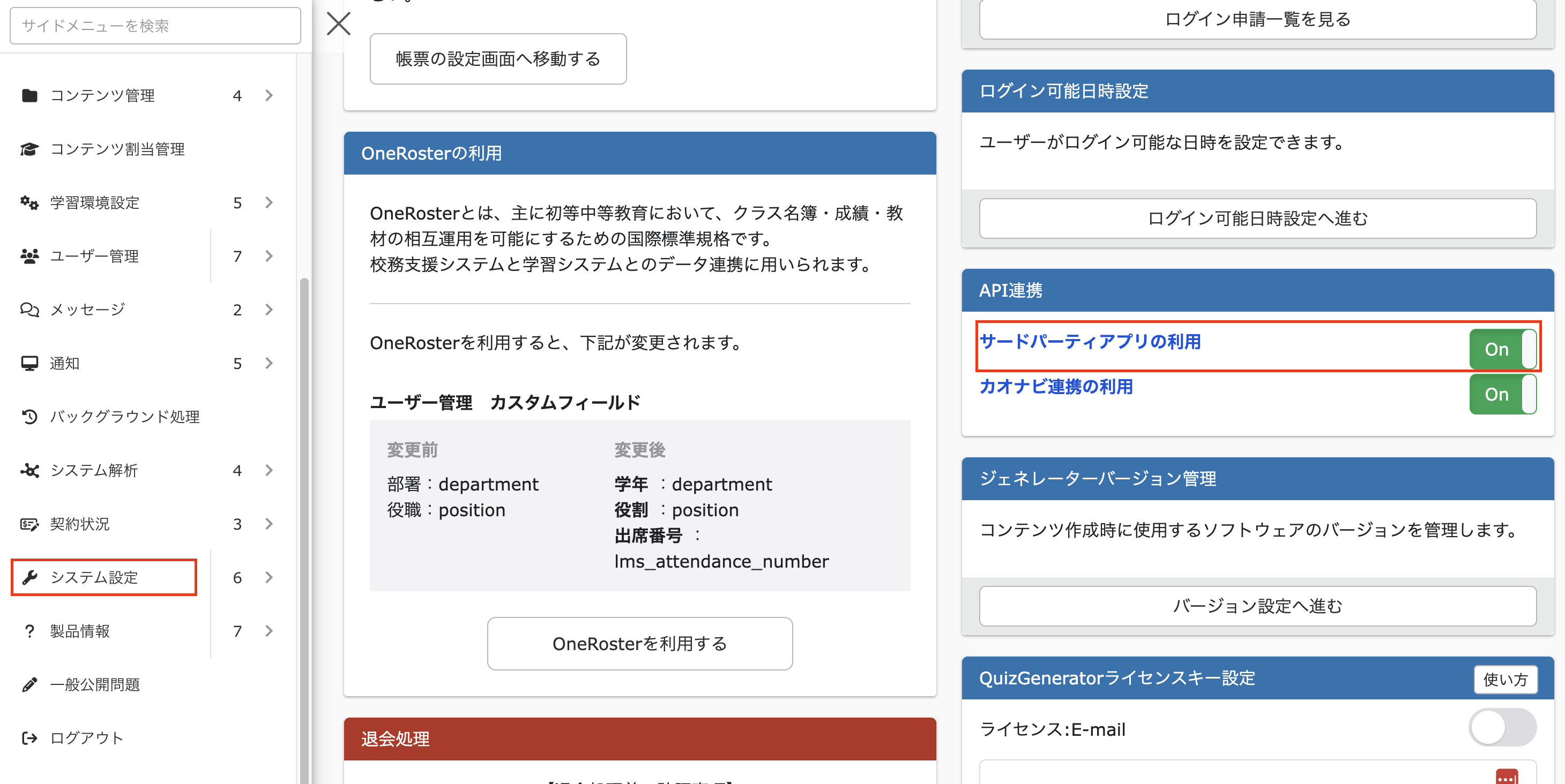 ログイン後、システム設定 > API連携 と進み、サードパーティアプリの利用をONにします。