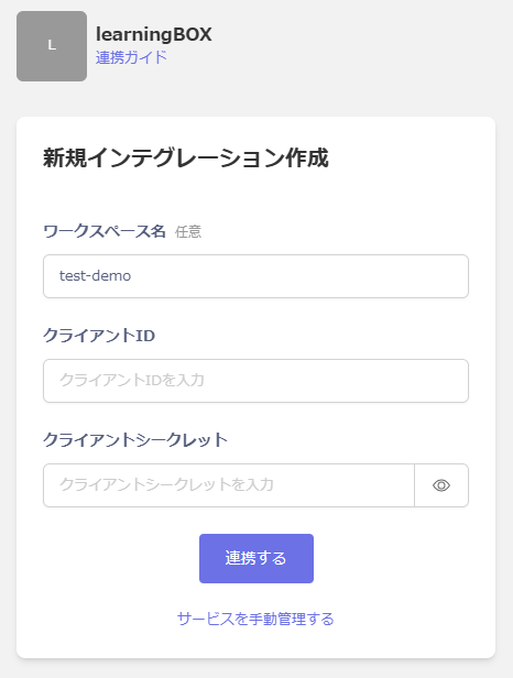 任意のワークスペース名、前の手順で取得したクライアントID、クライアントシークレットを入力し、連携するをクリックします。