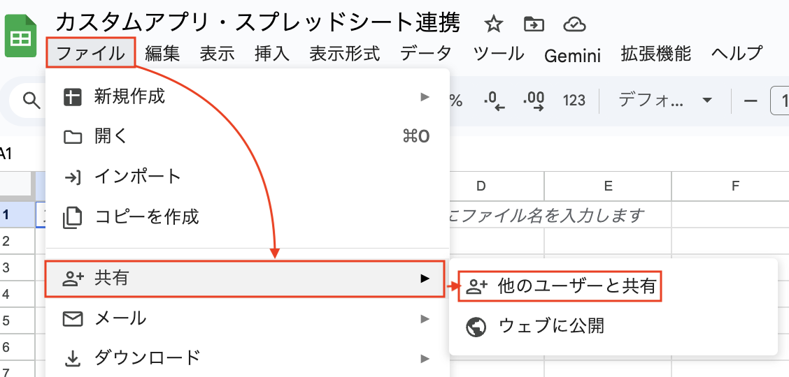 - Googleスプレッドシートの左上のファイル > 共有> 「他のユーザーと共有」をクリックします。