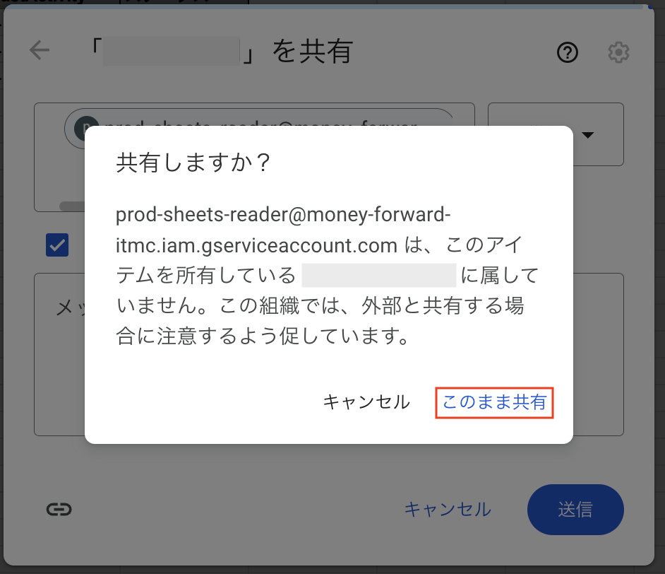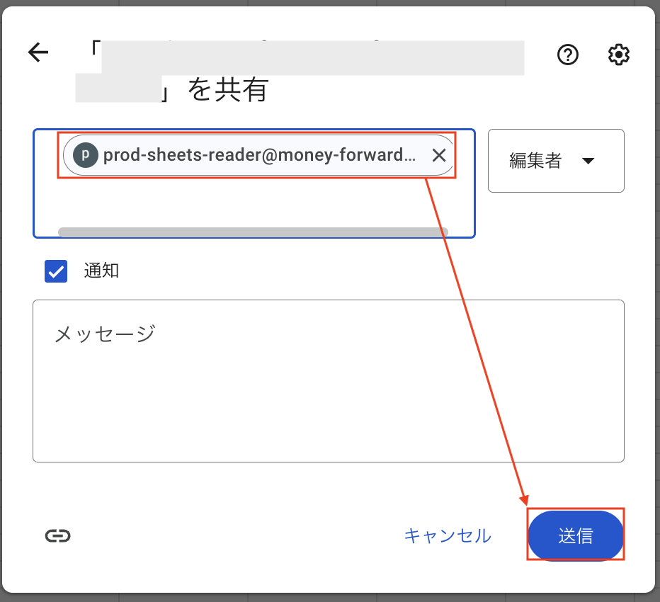 prod-sheets-reader@money-forward-itmc.iam.gserviceaccount.comを貼り付け、[送信]します。