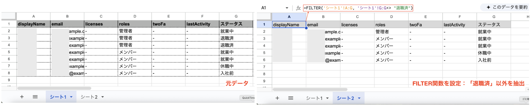「関数」を連携用スプレッドシートの「シート1」の1行目・A列に設定すると、「退職済」以外を抽出します。(ヘッダーは必須です。)