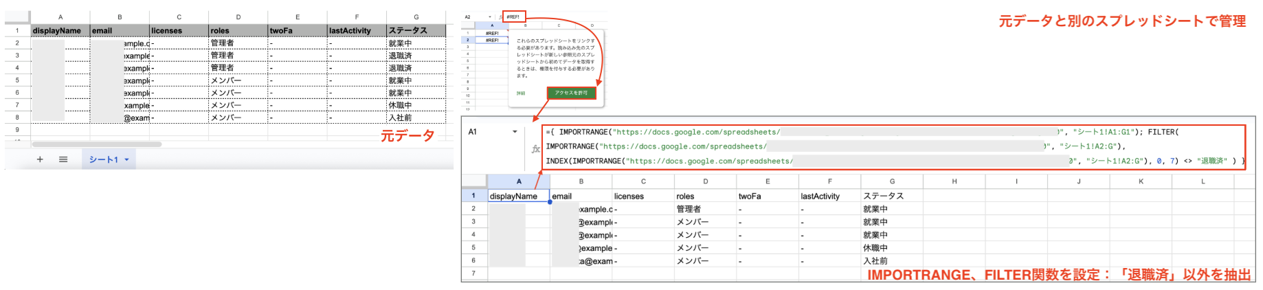 例:管理用スプレッドシートの元データから、「退職済」を除外して連携用スプレッドシートの「シート1」に自動で表示させる場合