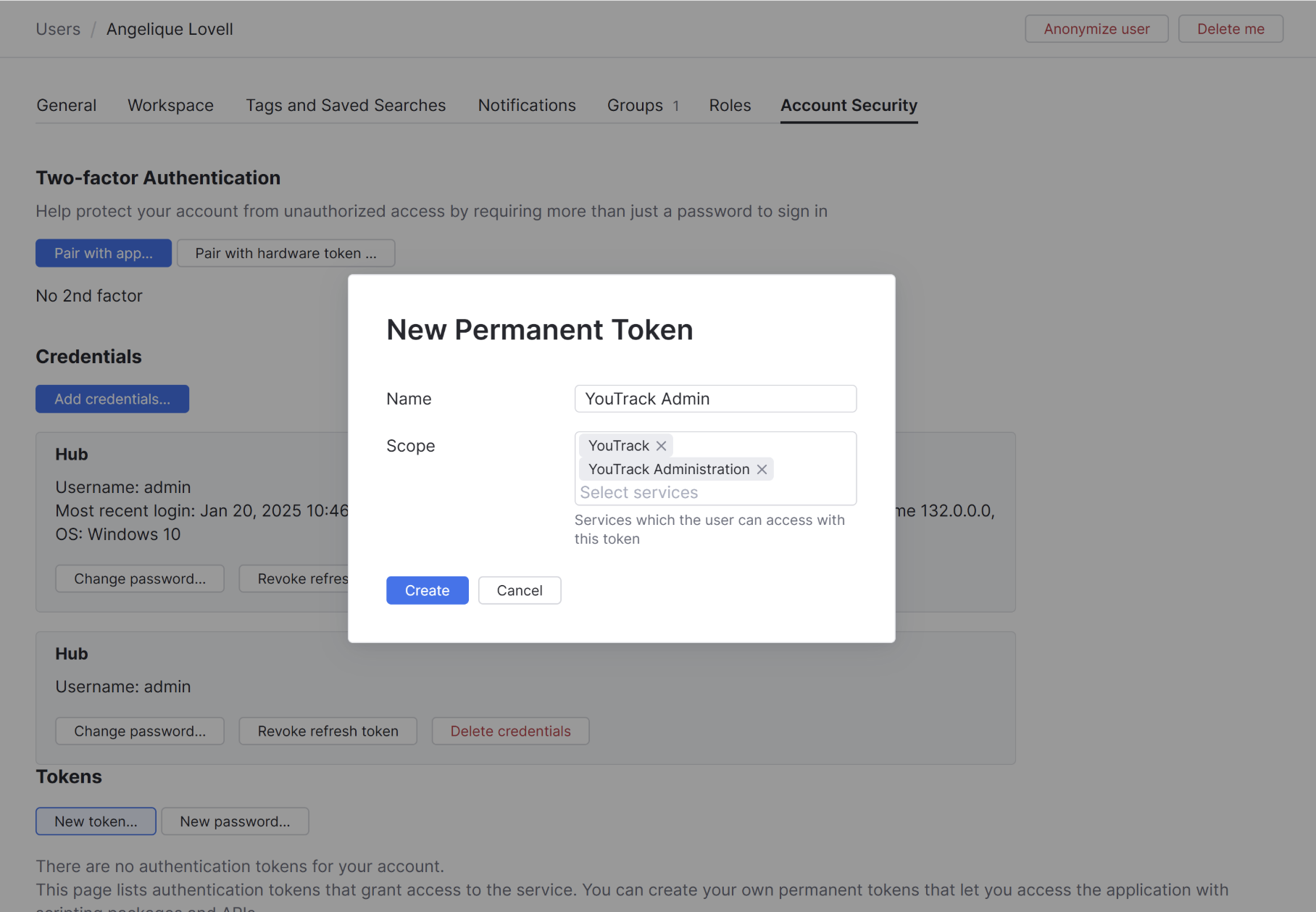 組み込みのHubサービスを使用しているYouTrackでは、以下のようにスコープが分かれています。