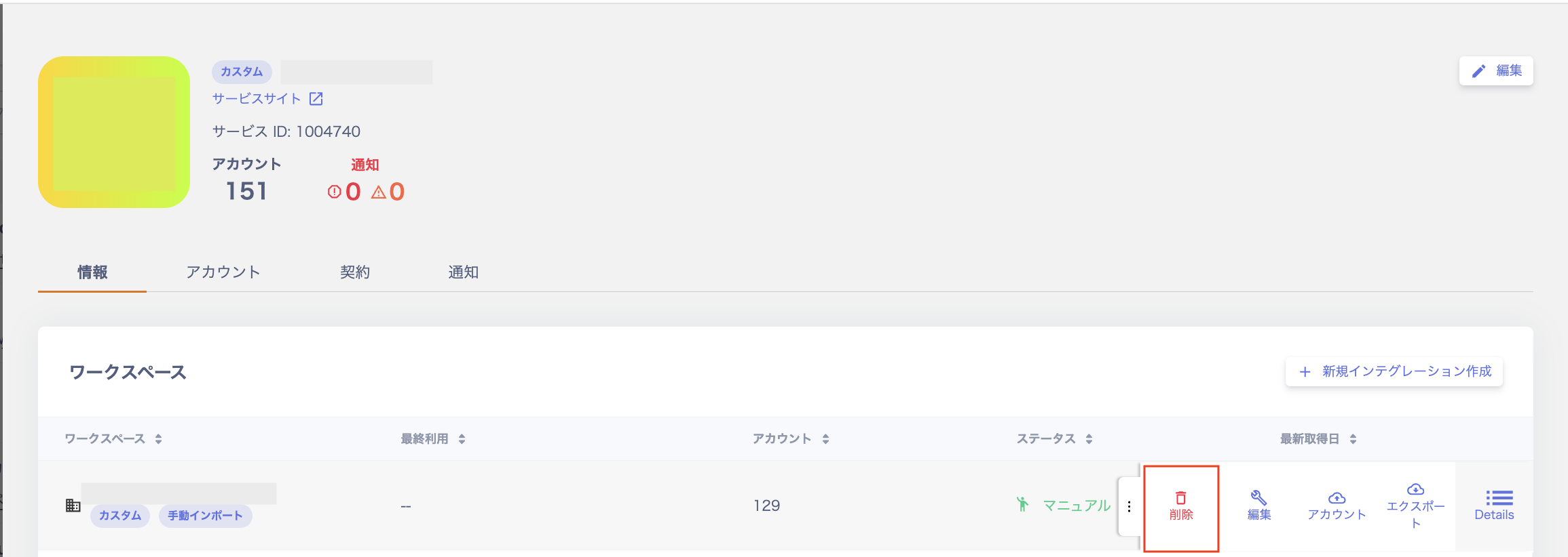 カスタムアプリは左側の項目「サービス/ワークスペース」で(カスタム)と表示されます。 - サービス詳細の「情報」> ワークスペースの右端の三点リーダー[︙]から[削除]をクリックします。
