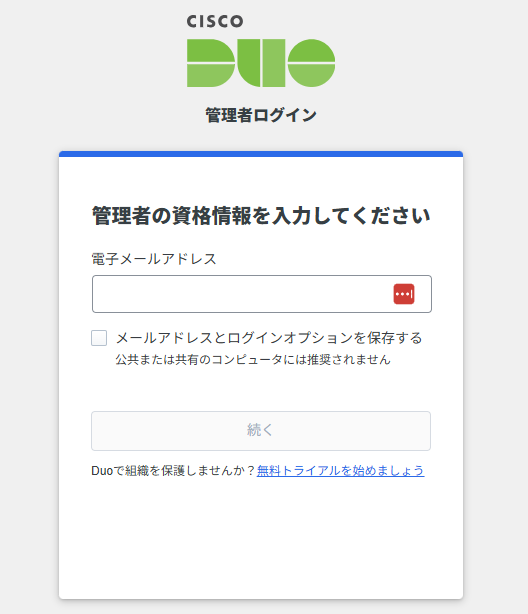 Cisco Duoログインページにて、メールアドレス・パスワードを入力し、ログインします。