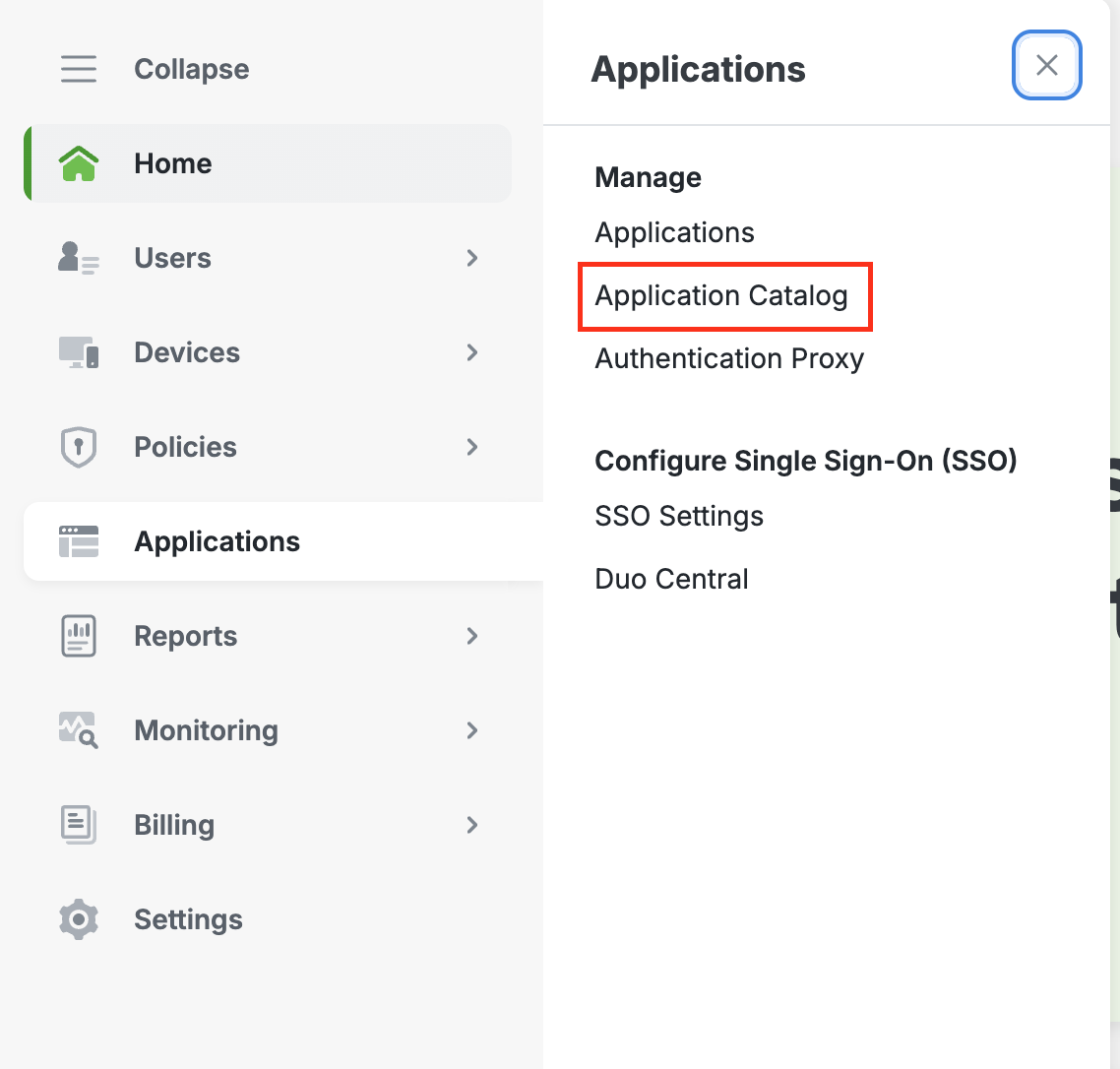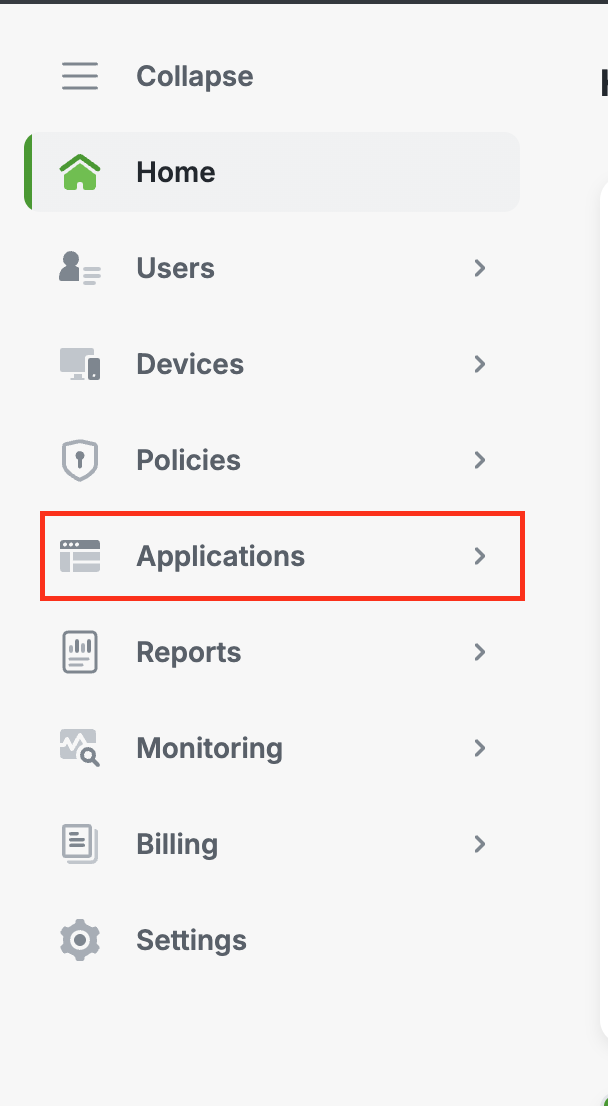 Cisco Duoログイン後、サイドメニューから Applications をクリックします。