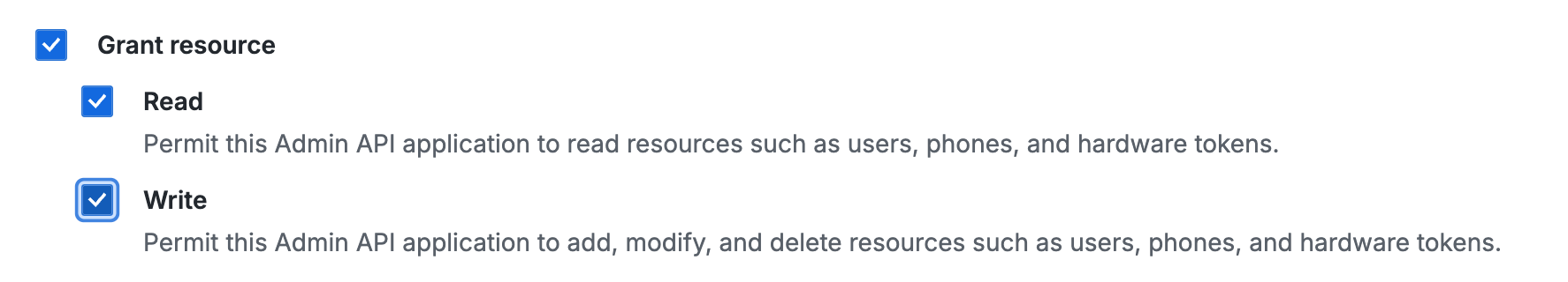 Application name を入力し、Grant resource の Read、Write にチェックを入れます。