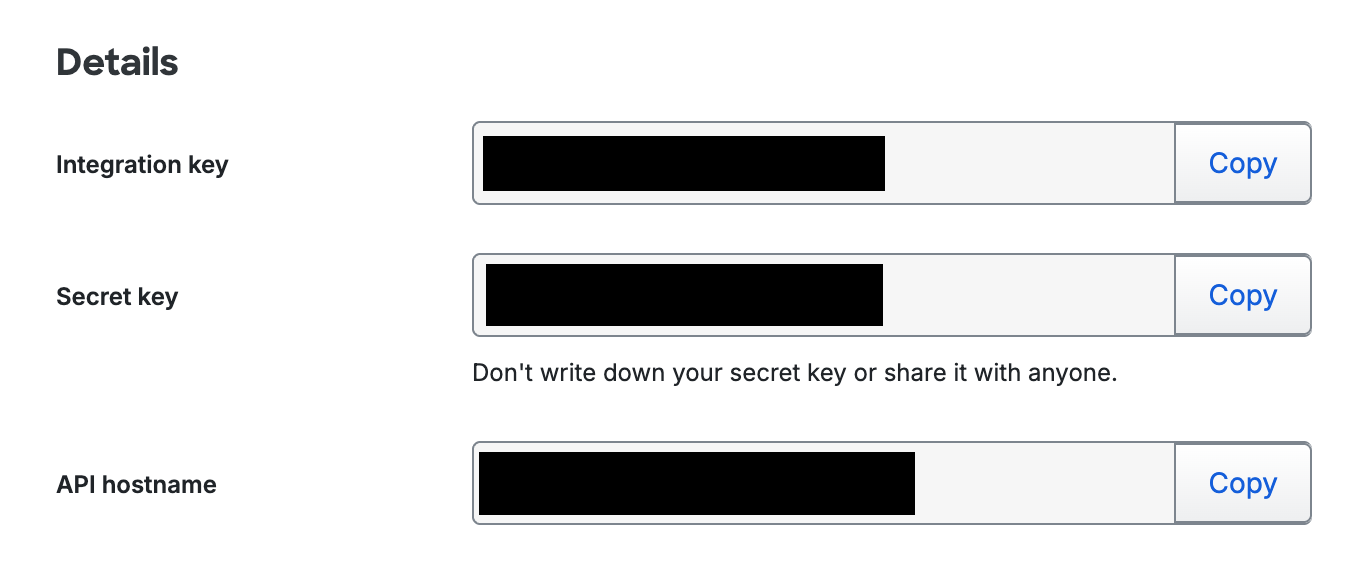 Integration key が APIキー、Secret key が クライアントシークレット、API hostname が Base URLなので、コピーします。