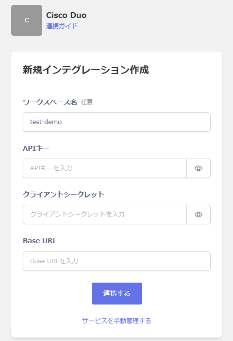任意のワークスペース名、前の手順で取得したAPIキー、クライアントシークレット、Base URLを入力し、連携するをクリックします。