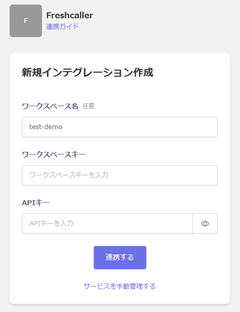任意のワークスペース名、前の手順で取得したワークスペースキー、APIキーを入力し、連携するをクリックします。