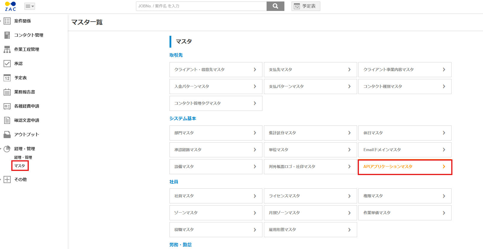 ZACにログイン後、経理・管理 > マスタ > APIアプリケーションマスタ をクリックします。