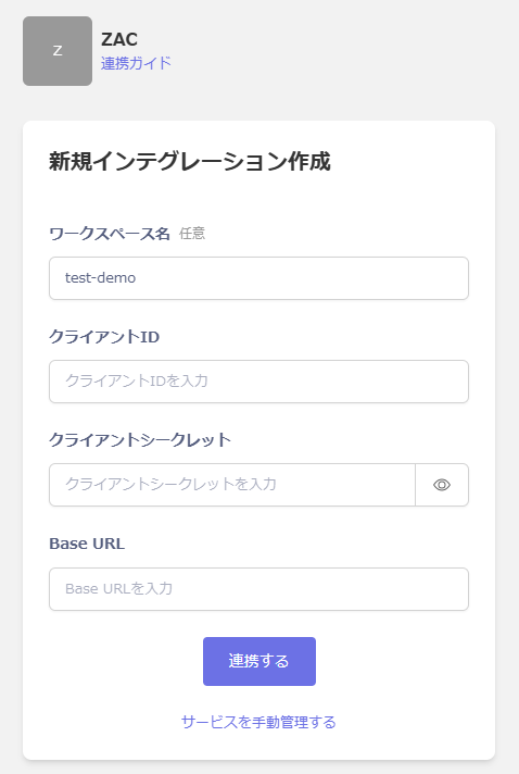 任意のワークスペース名と、前の手順で取得したクライアントID、クライアントシークレット、Base URLを入力し、連携するをクリックします。