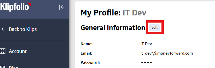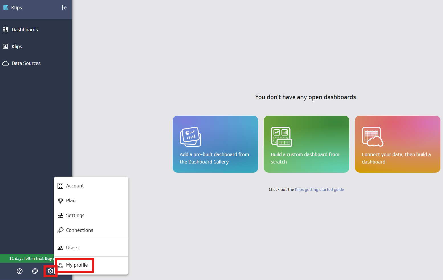 Klipfolioログイン後、画面左下の 設定(歯車マーク) > My profile をクリックします。