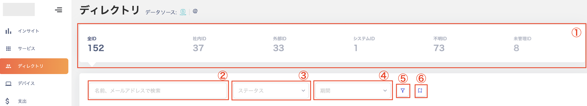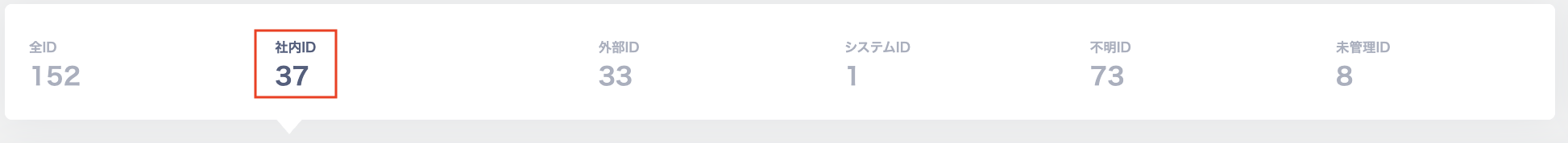 ①ID種別での絞り込み:ID種別(全ID/社内ID/外部ID/システムID/不明ID/未管理ID)で絞り込めます。