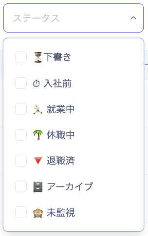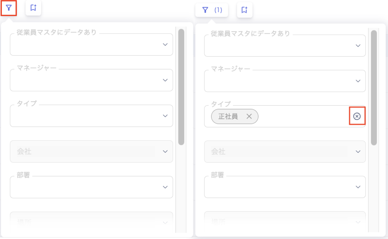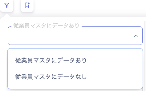 「従業員マスタにデータあり/従業員マスタにデータあり」で絞り込めます。設定>組織>従業員マスター設定で従業員マスターを設定している場合に絞り込めます。