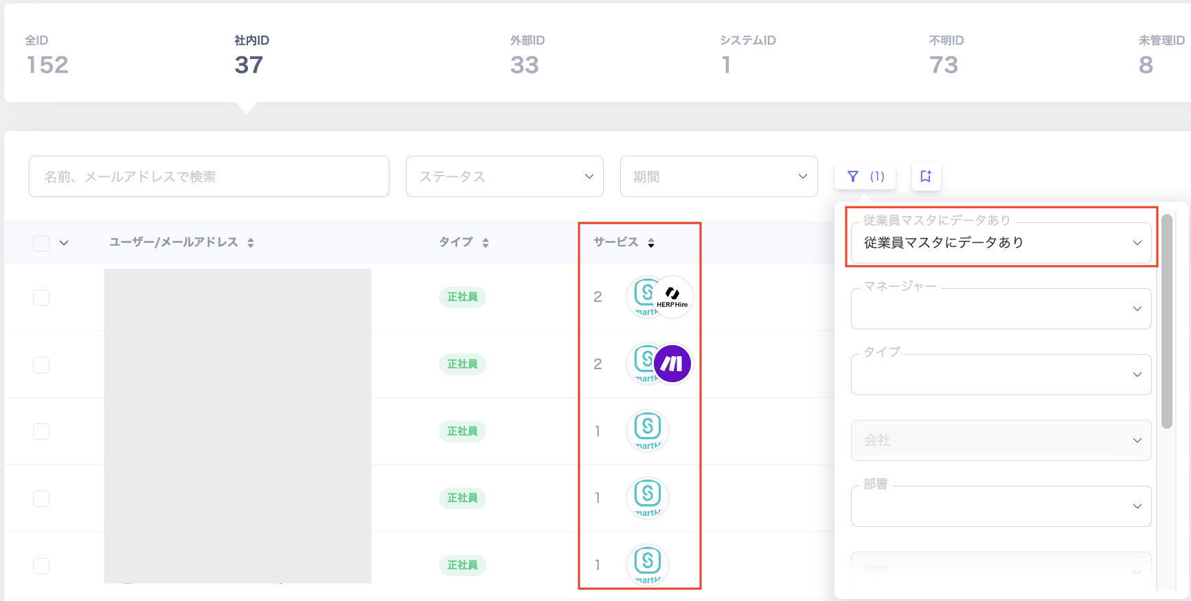 「従業員マスタにデータあり」で絞り込むと、「サービス」欄に従業員マスターに設定したサービスが表示されます。