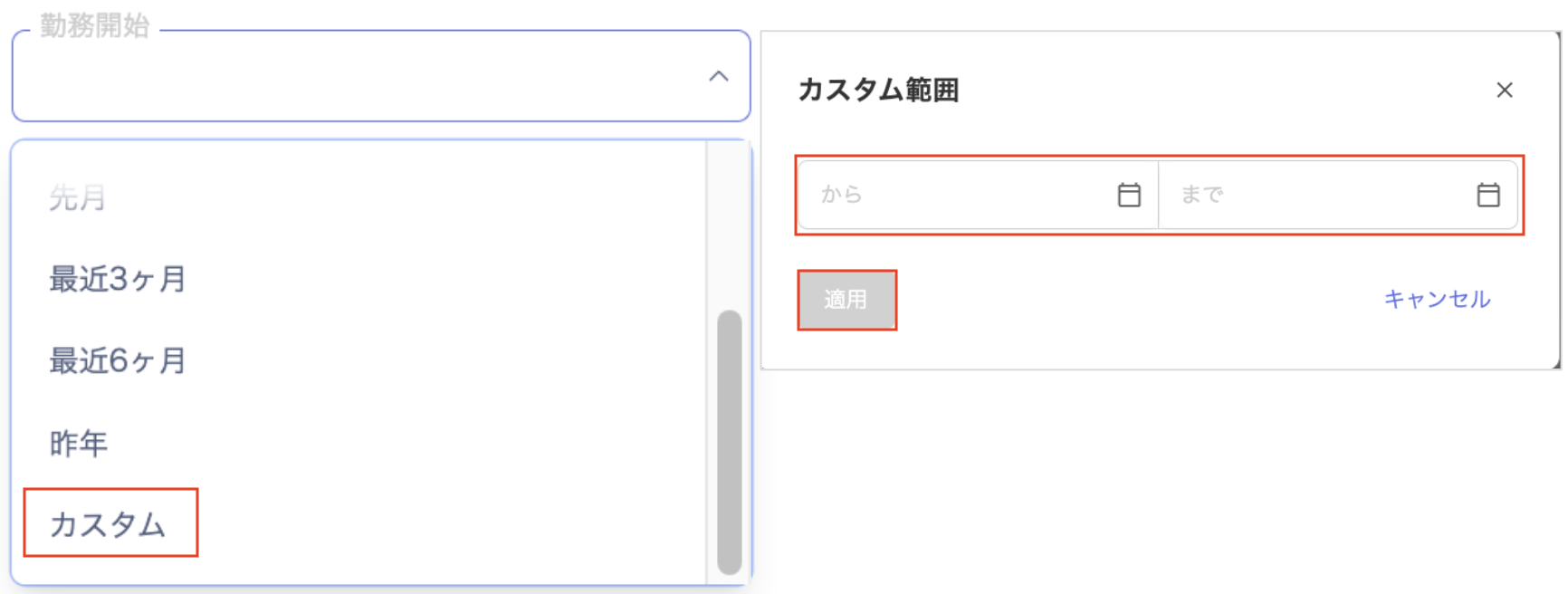 カスタムを選択すると、「カスタム範囲」画面が表示されます。指定期間を設定して、[適用]をクリックします。