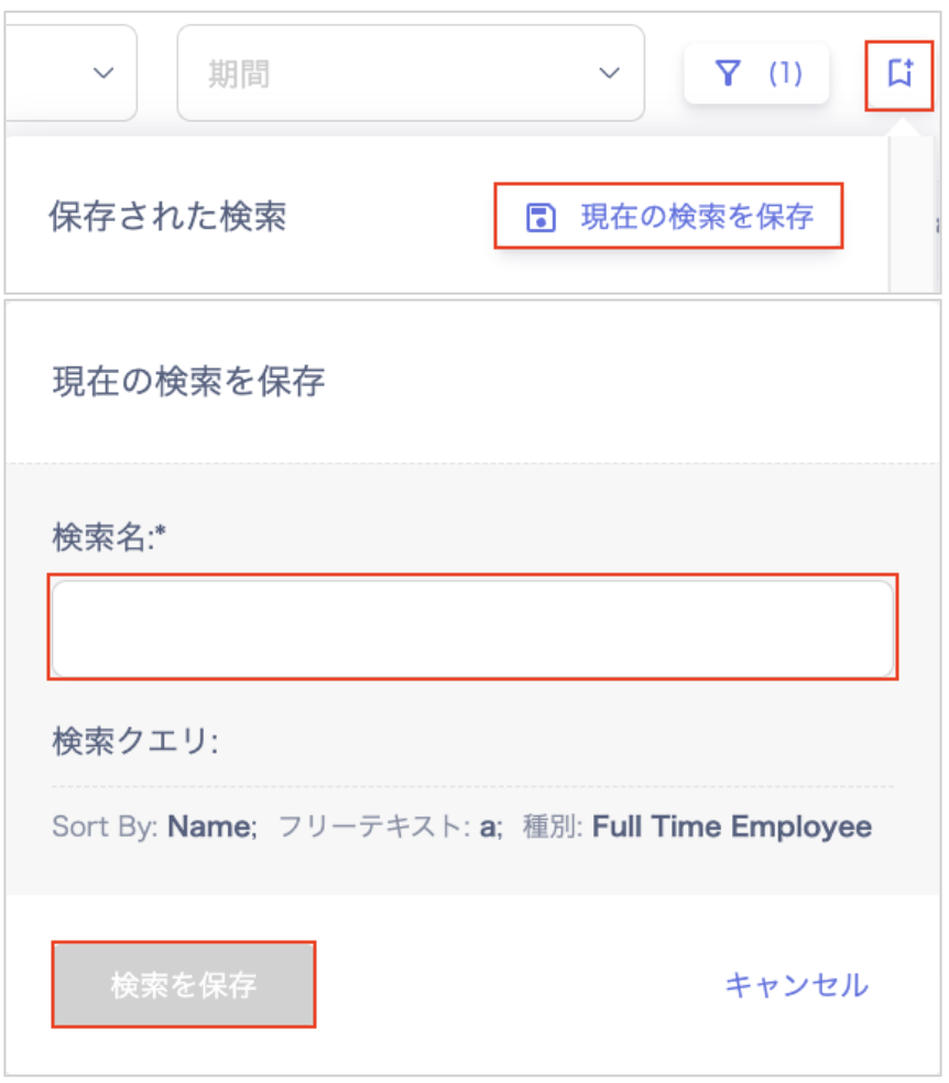 検索条件は[検索を保存]>[現在の検索を保存]から「検索名」を入力して、[検索を保存]します。