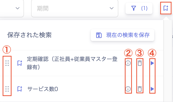 ①並び替え:保存された検索条件の並び替えが行えます。カーソルを合わせて上下に移動します。