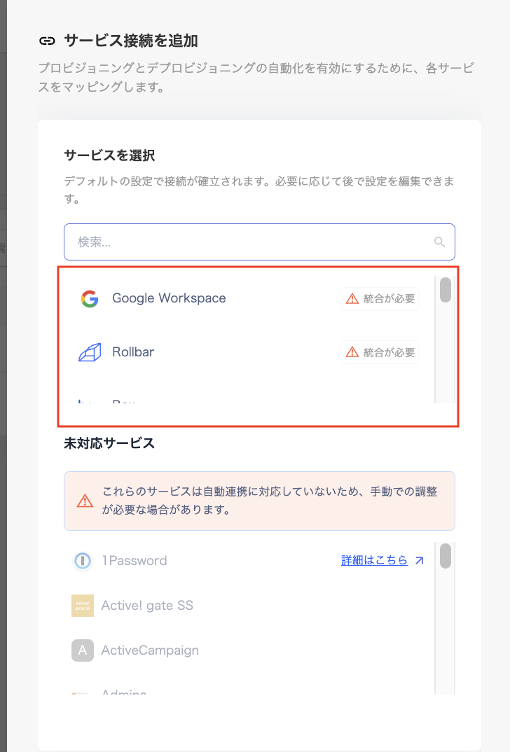「サービスを選択」に表示されるサービスが現在対応しているサービス、未対応サービスは現在未対応のサービスです。