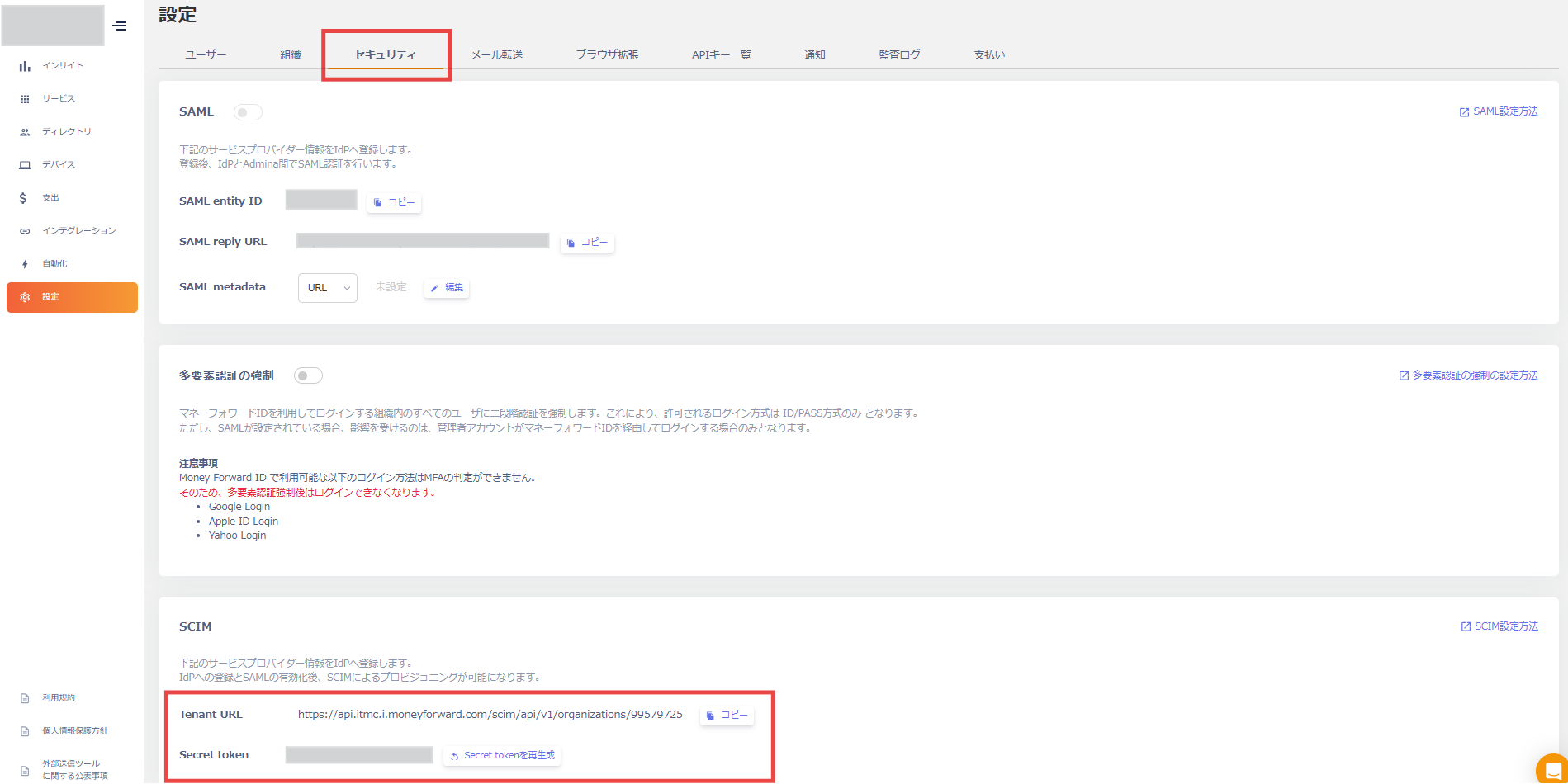 設定 > セキュリティ の「SCIM」 でIdPの設定画面に必要なtenant URLとsecret tokenを取得できます。Secret tokenがない場合は生成ボタンを押してください。