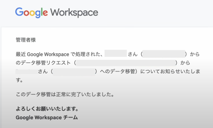 データ移管処理が完了すると「*さんから*さんへのGoogleWorkspaceデータ移管処理は正常に完了しました」と表示されます。