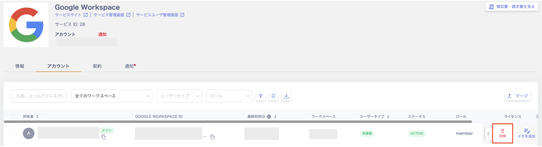 - サービス > GoogleWorkspace > アカウント>移行するアカウントの右端の三点リーダーから[削除]を選択してください。