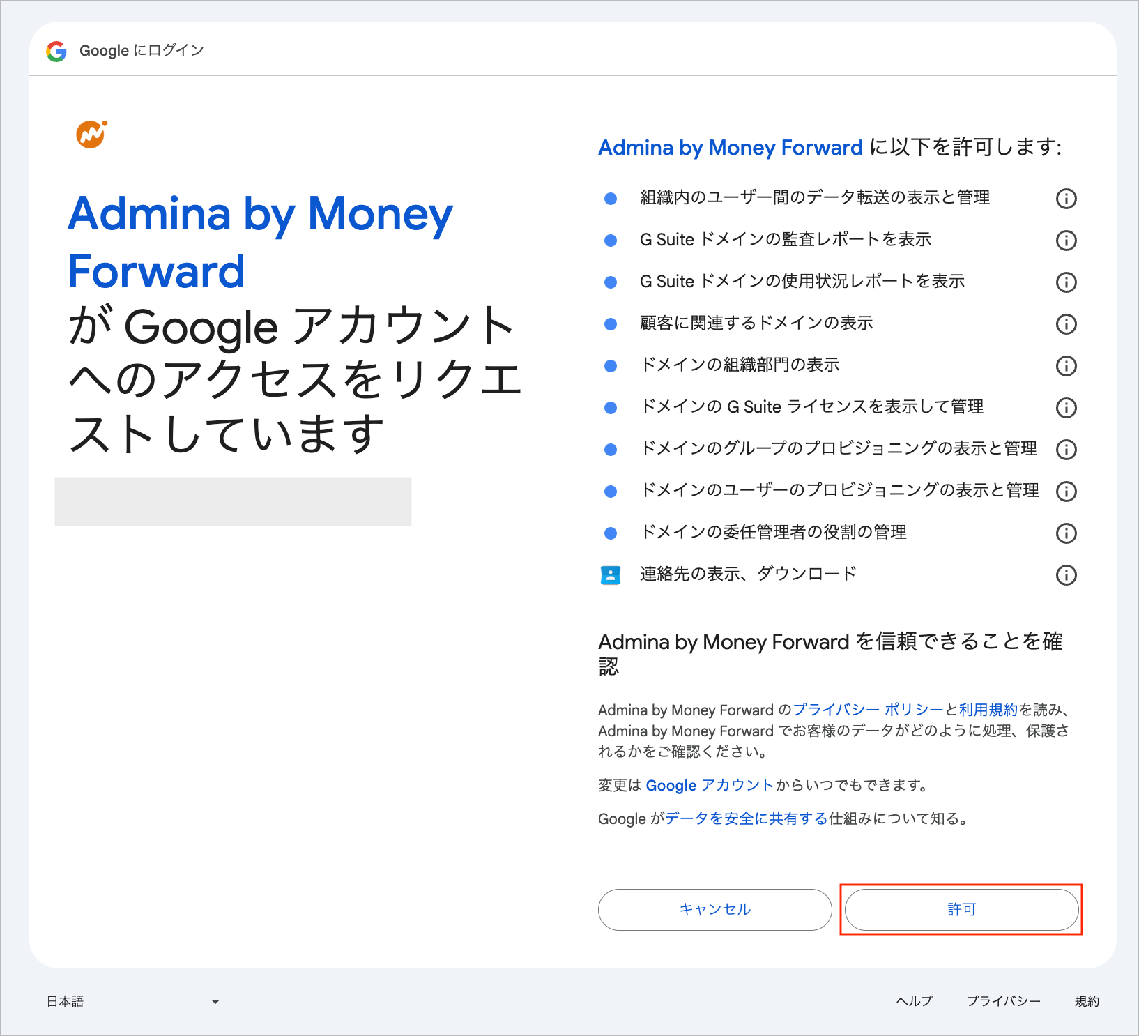 再連携時に「Googleアカウントへのアクセスをリクエストしています」と表示されますので、確認して[許可]します。
