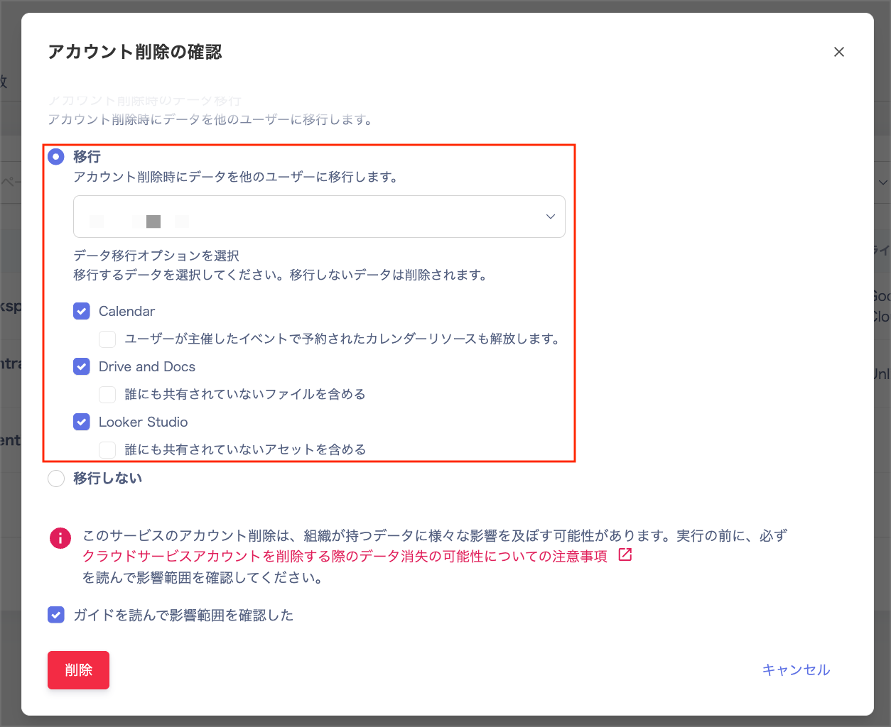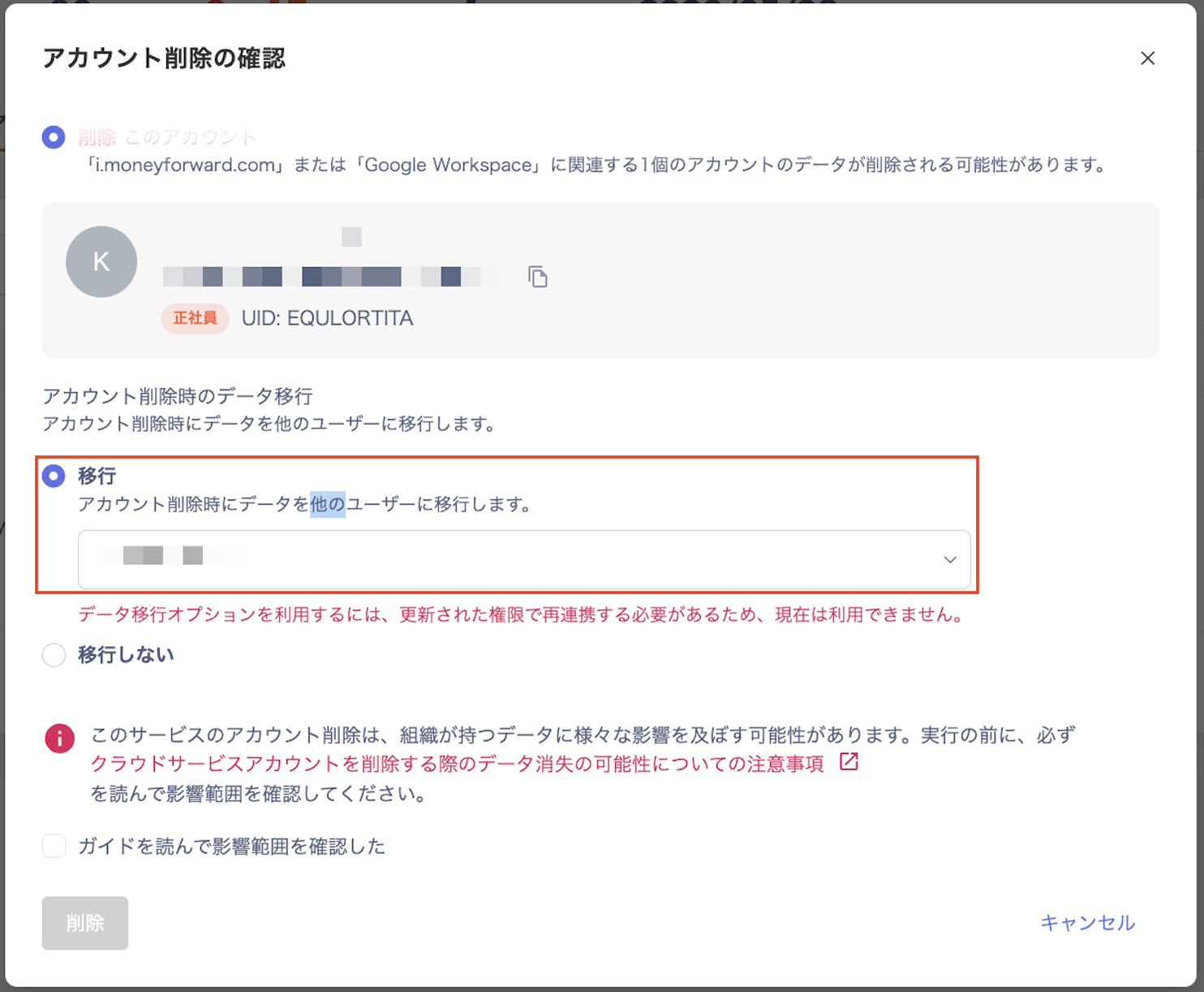 - 「アカウント削除の確認」画面で「移行」を選択して、移行するユーザーを選択してください。