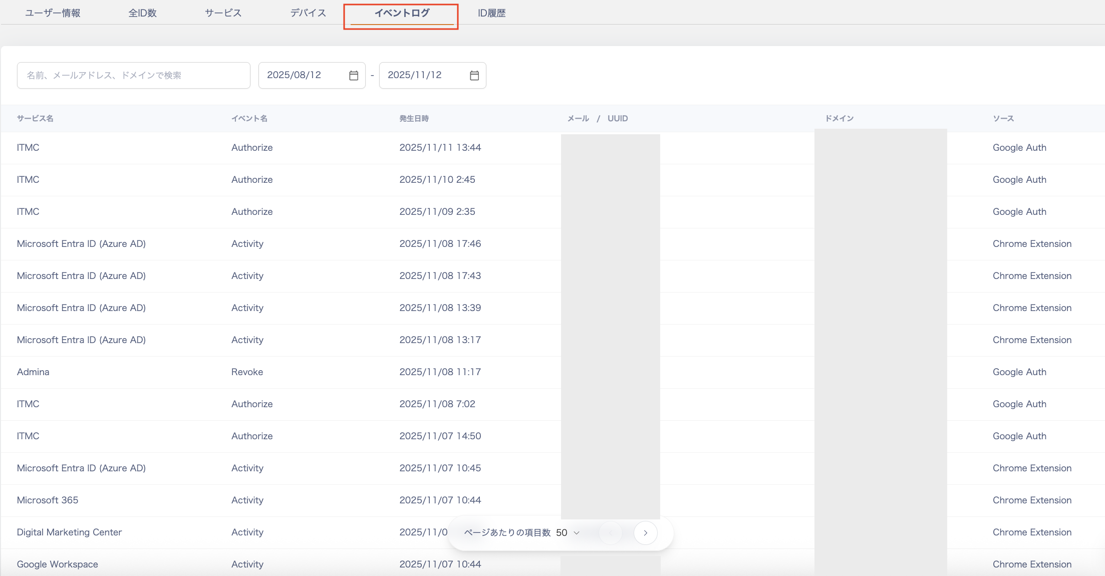 イベントログの検索は「名前、メールアドレス、ドメイン」やサービス名でも検索できます。